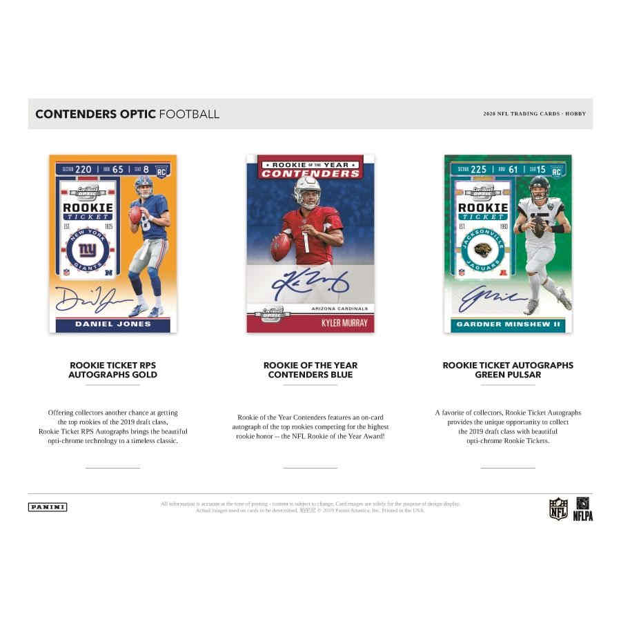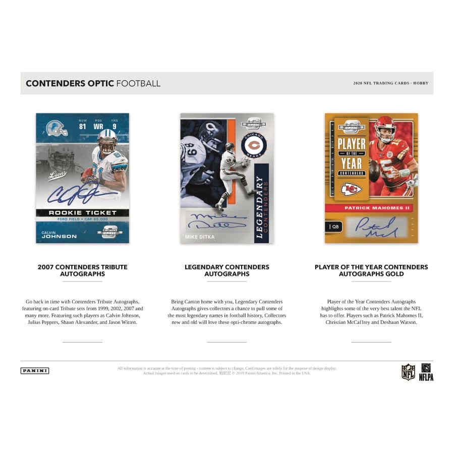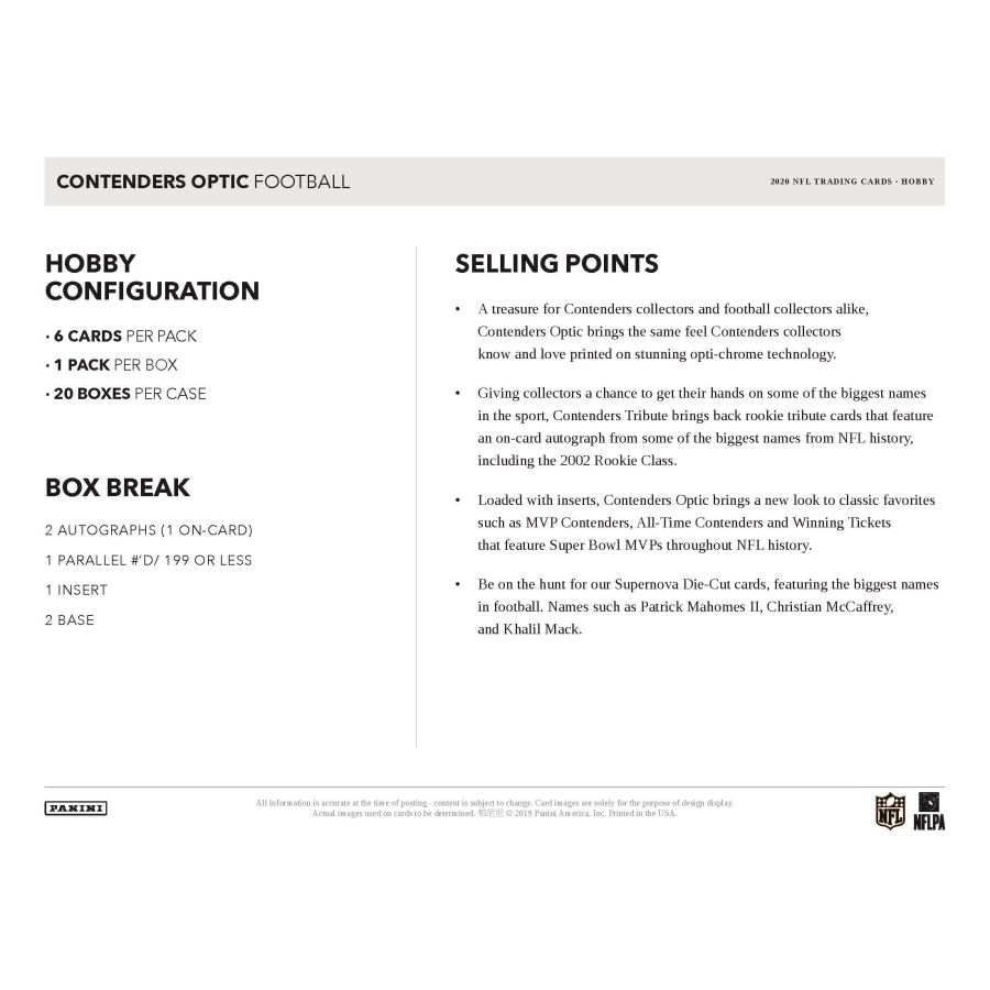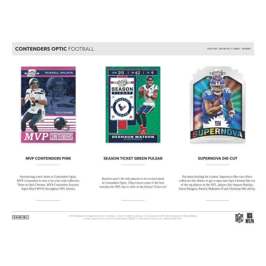 - LOADED with inserts, Contenders Optic brings a new look to classic favorites such as MVP Contenders, All-Time Contenders and Winning Tickets that feature Super Bowl MVPs throughout NFL history.