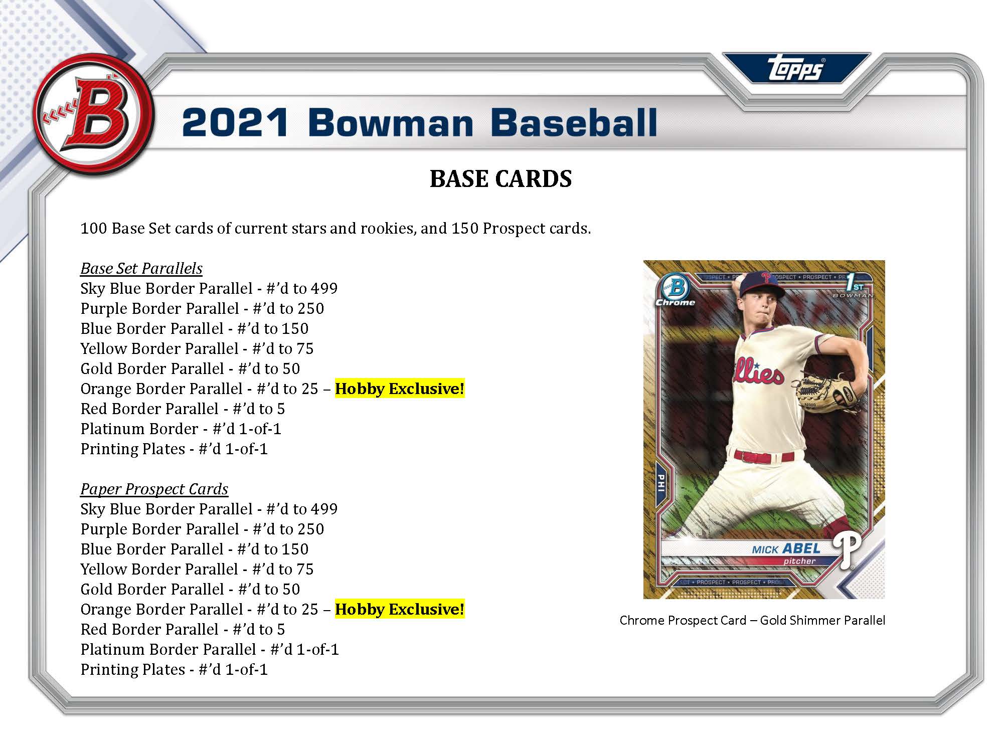2021 Bowman Baseball Base Cards – 100 Base Set Cards of current stars and rookies, plus 150 Prospect Cards.