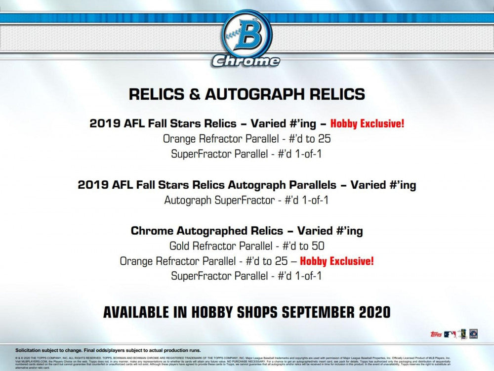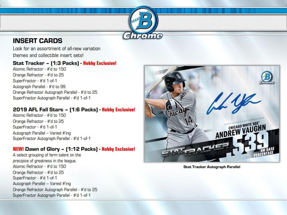 Bowman Chrome rounds out a checklist of the top prospects and rookies for 2020, with a variety of exciting autograph inserts and parallels on chrome stock!