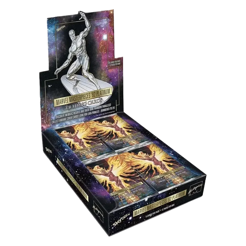 Marvel Masterpieces '92 Platinum is the platinum edition of the original 1992 Marvel Masterpieces! In this set, you will rediscover the original artwork via an enhanced variety of inserts and parallels such as Battle Spectrum, Precious Metal Gems, and Variant Covers...all highlighting Marvel characters in the brightest way!
