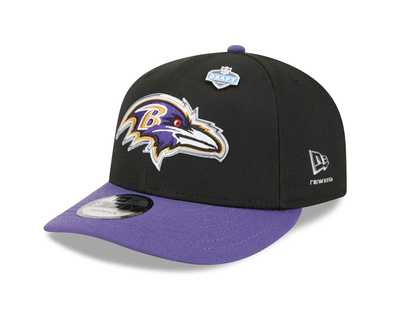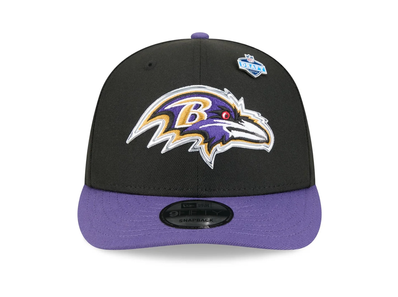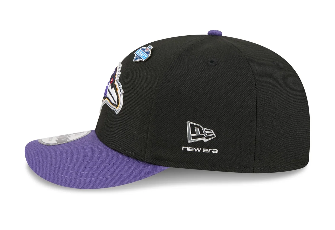 The Baltimore Ravens 2026 Draft Pre-Curved 9FIFTY Snapback features a heat sealed liquid chrome Ravens patch and an Official 2026 NFL Draft pin at the front panels with a matching New Era Flag at the left-wear side and an NFL Shield above a team wordmark on a snapback closure at the rear. Additional details include a city inspired interior fabrication with a Play Like a Raven wordmark at the rear tape, a purple pre-curved visor, and a gray undervisor.