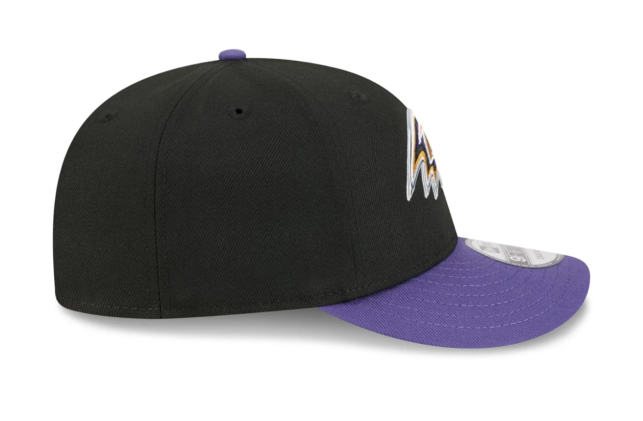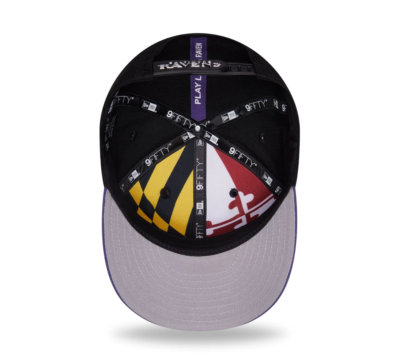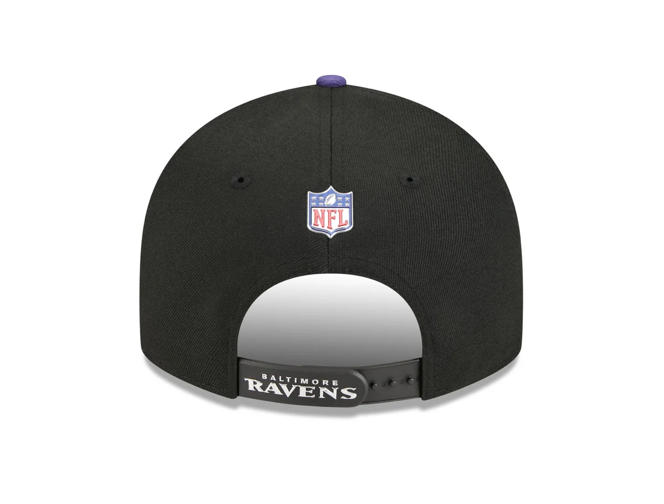 The Baltimore Ravens 2026 Draft Pre-Curved 9FIFTY Snapback features a heat sealed liquid chrome Ravens patch and an Official 2026 NFL Draft pin at the front panels with a matching New Era Flag at the left-wear side and an NFL Shield above a team wordmark on a snapback closure at the rear. Additional details include a city inspired interior fabrication with a Play Like a Raven wordmark at the rear tape, a purple pre-curved visor, and a gray undervisor.