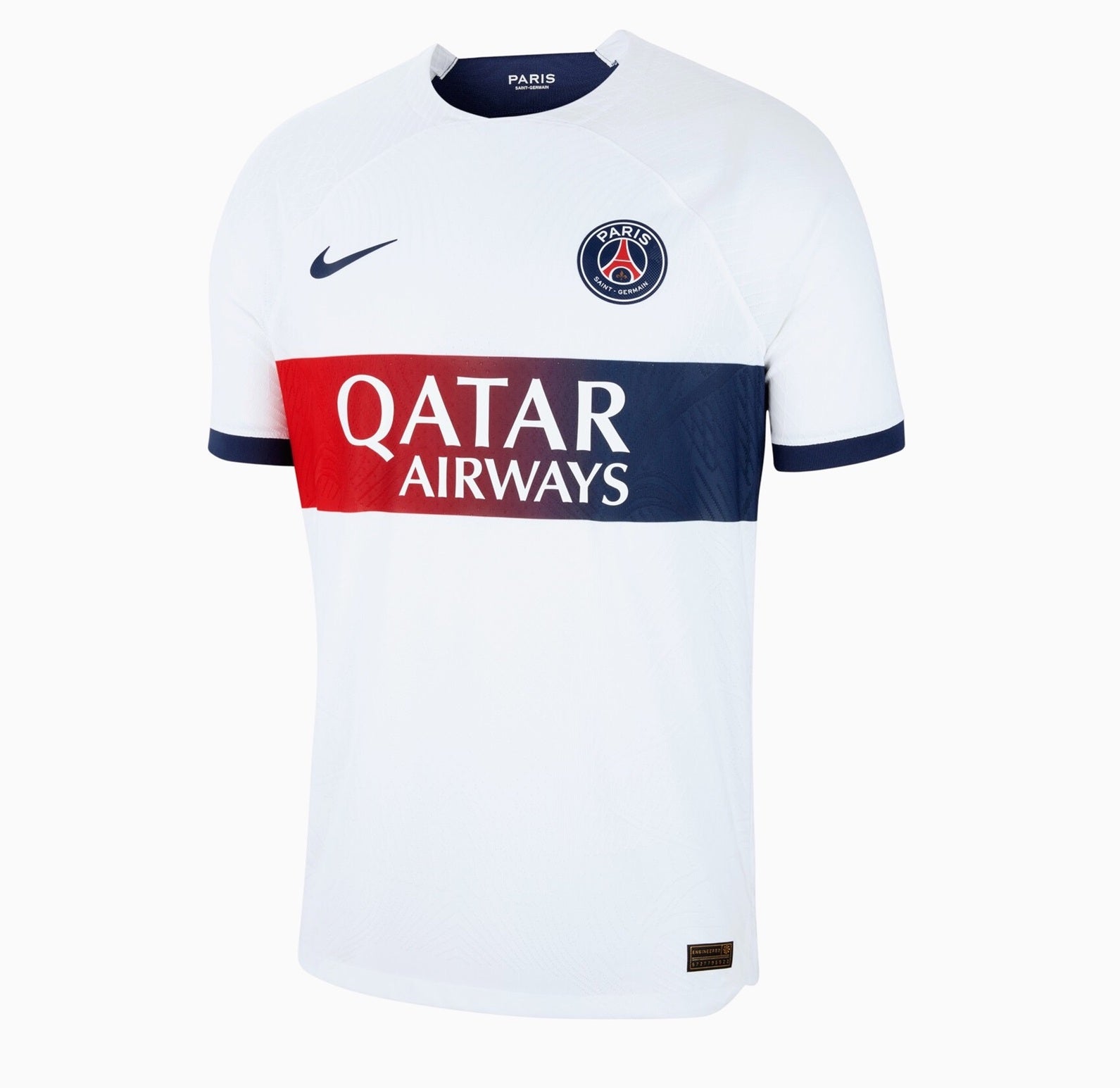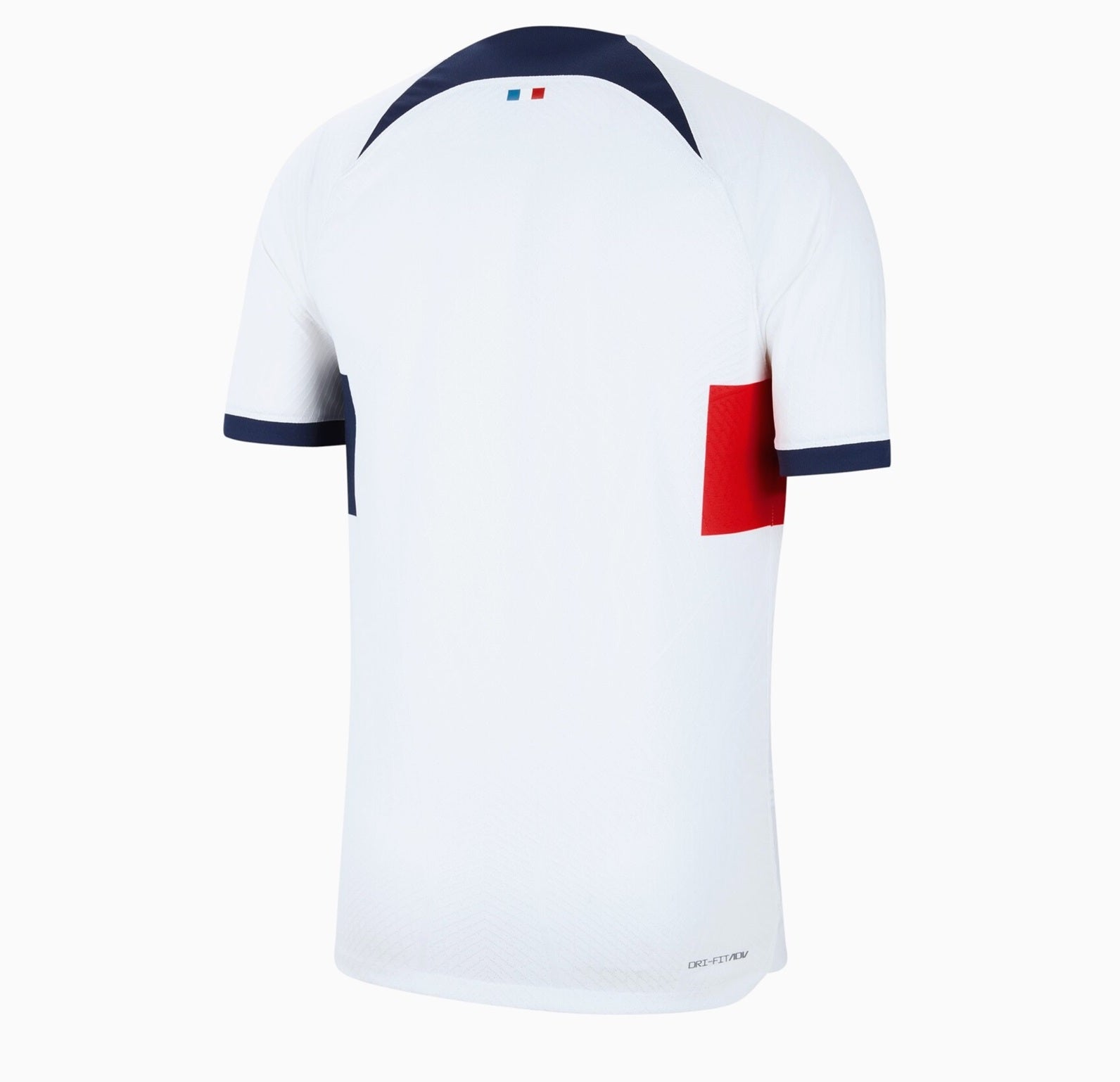 The inspiration for the PSG 2023/24 Away kit comes from La Ville Lumiere (City of Light). The white shirt features a graphic fading from red to blue, mimicking the way the iconic lights of Paris fade into the night sky. The inner pride features the team name, while the outer pride features the French flag. Our Stadium collection pairs replica design details with sweat-wicking technology to give you a game-ready look inspired by your favourite team.