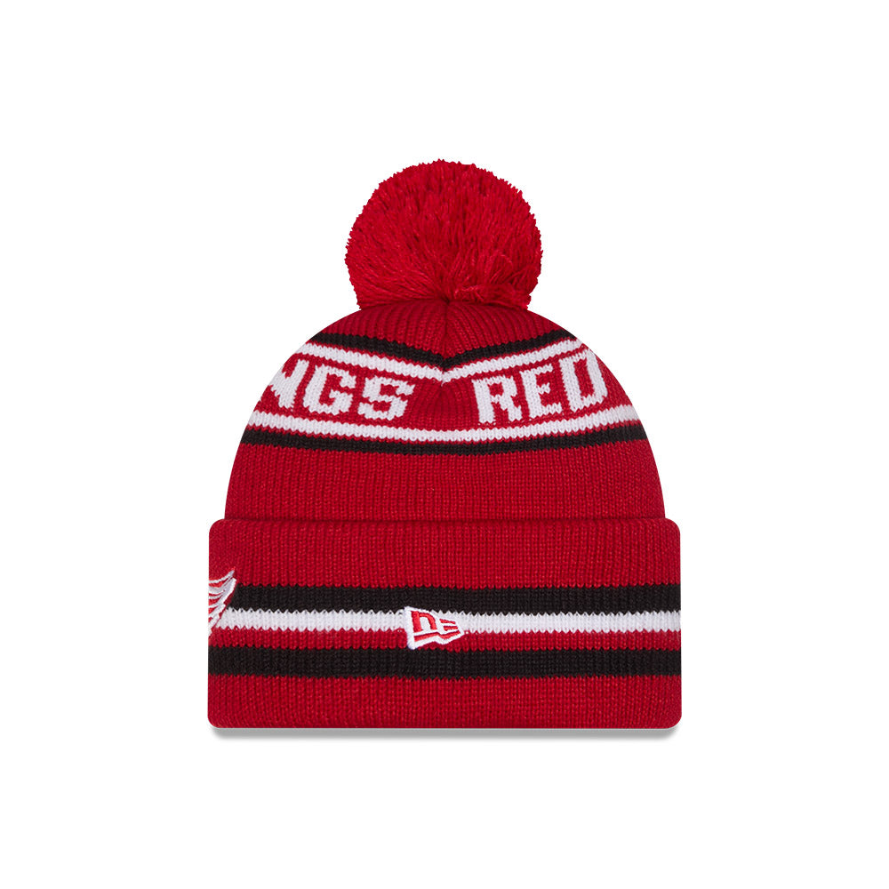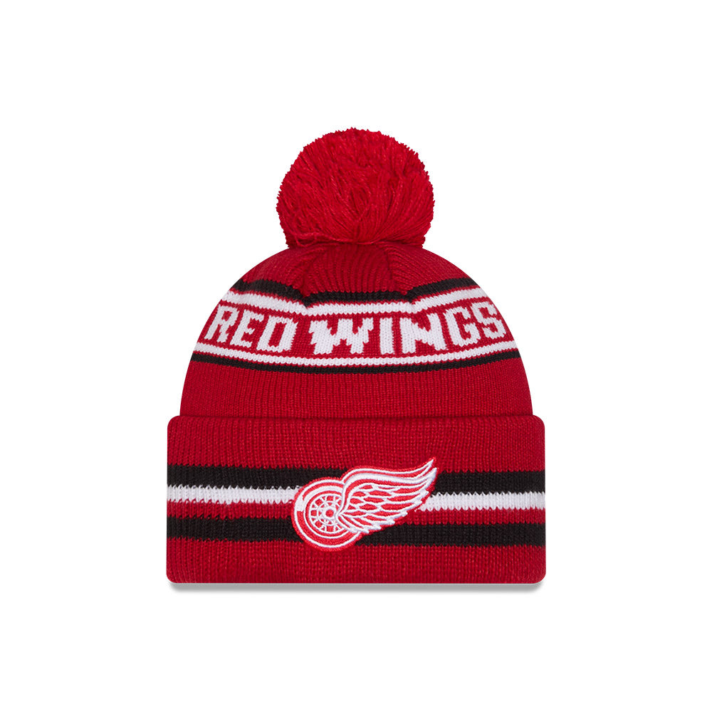 The Detroit Redwings Retro Pom Knit Hat features an embroidered Redwings logo at the front cuff with a team wordmark at the crown and a one-time removable pom.