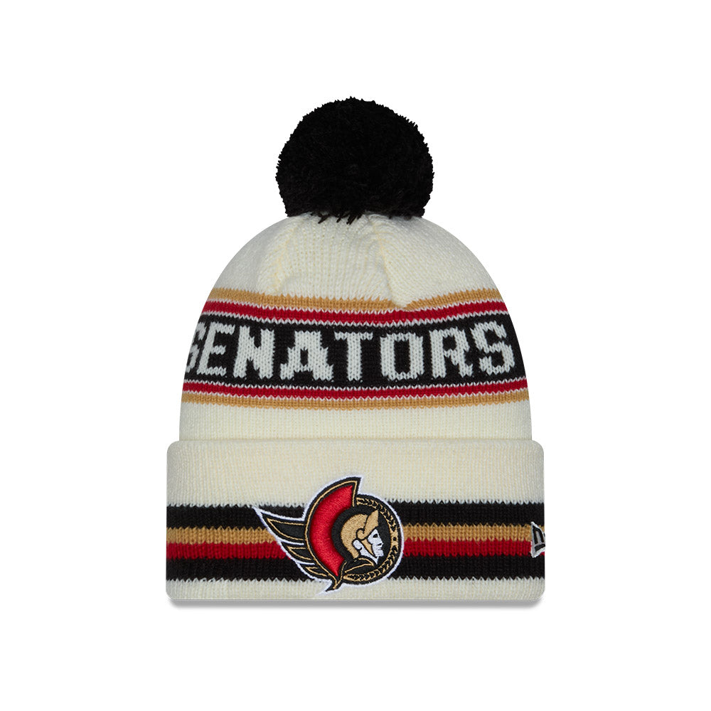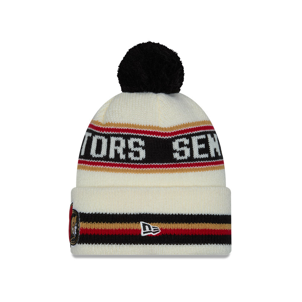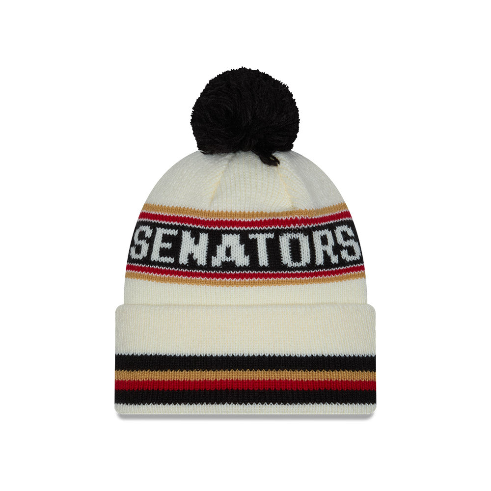 The Ottawa Senators Retro Pom Knit Hat features an embroidered Senators logo at the front cuff with a team word mark at the crown and a one-time removable pom.