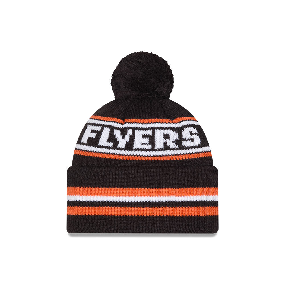 The Philadelphia Flyers Retro Pom Knit Hat features an embroidered Flyers logo at the front cuff with a team word mark at the crown and a one-time removable pom.