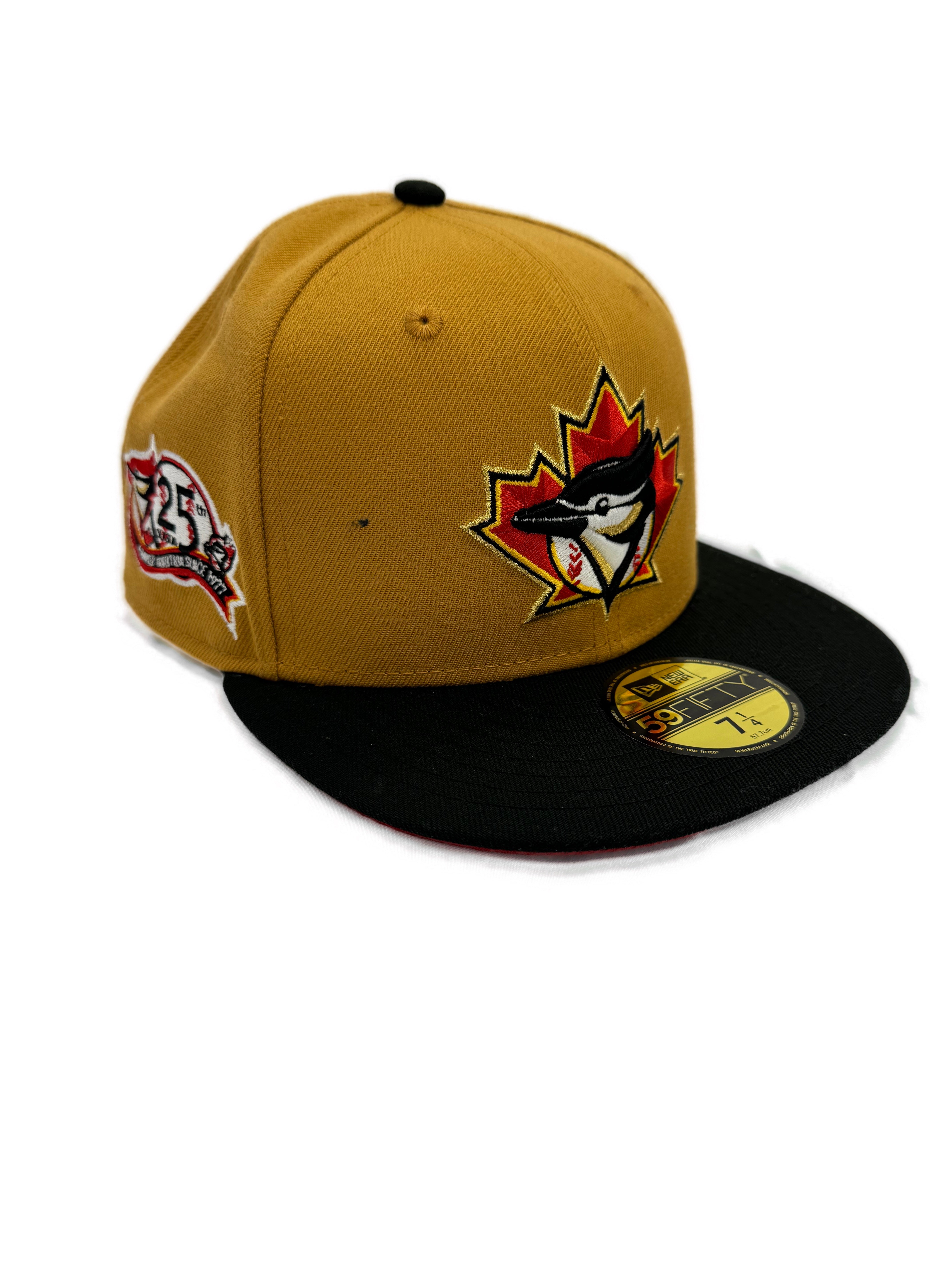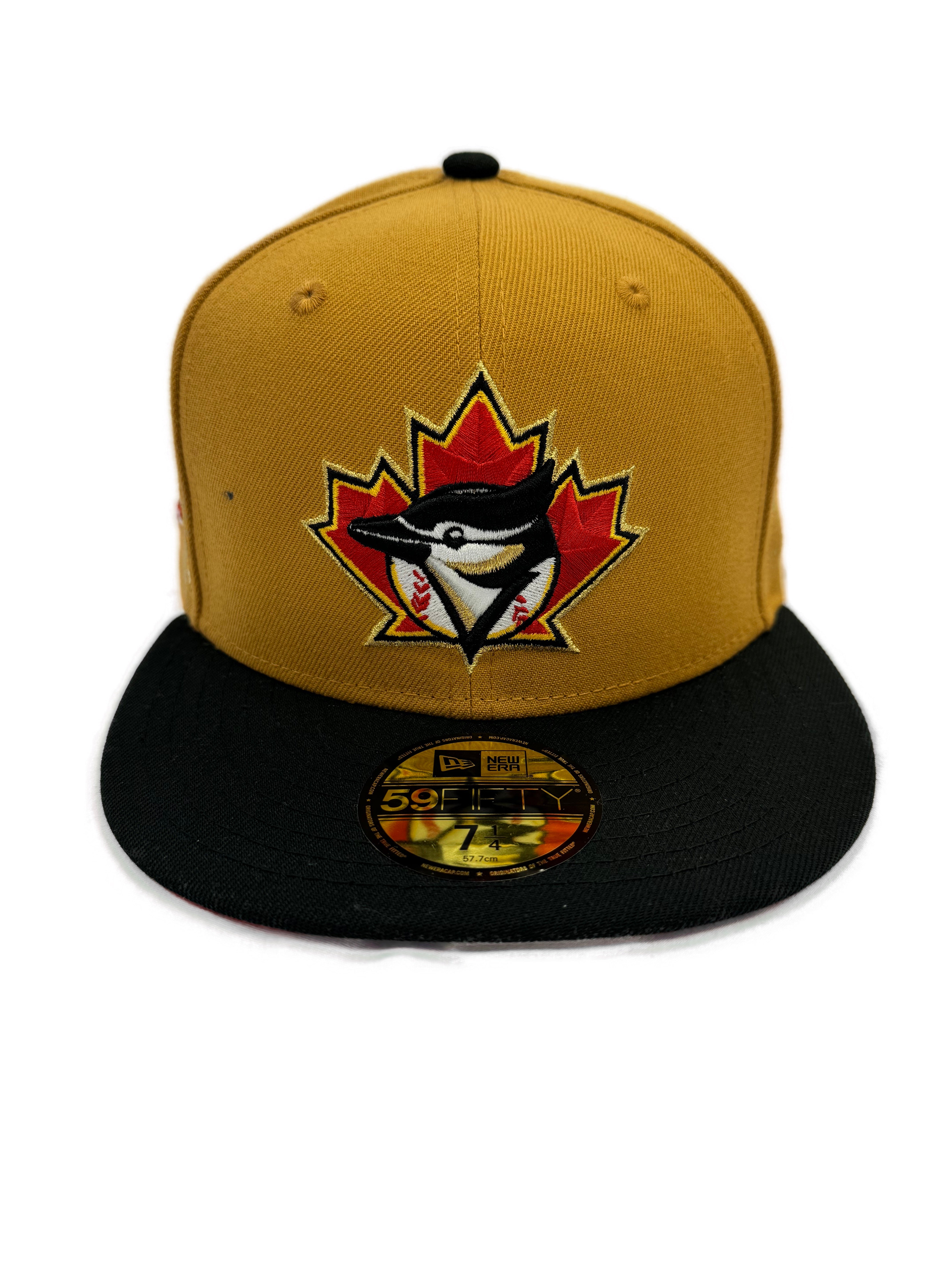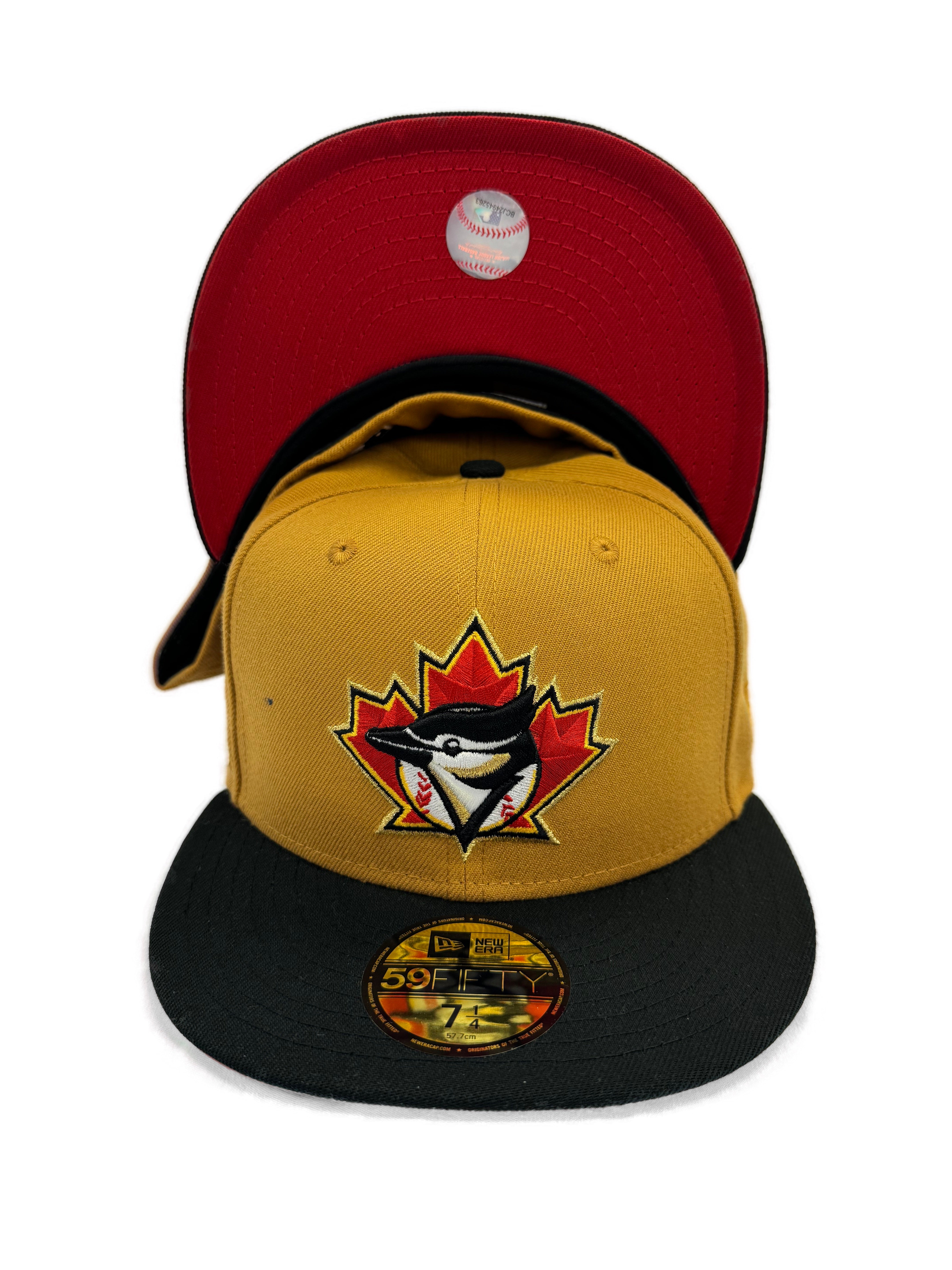 This special Toronto Blue Jays custom hat is in the whiskey body with a black beak and a red under visor. The front logo is the Jays Cooperstown logo in its custom colours, with the MLB batter man logo on the back.